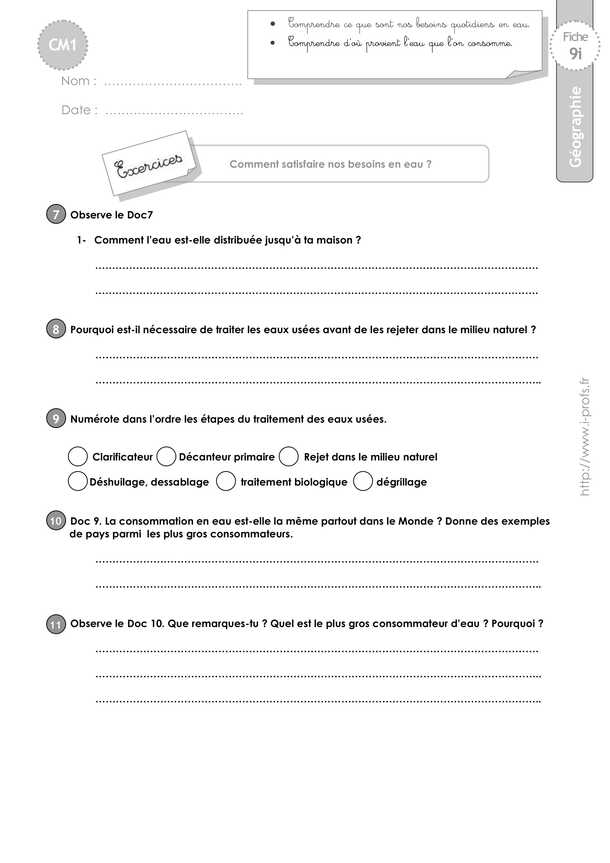 Géographie CM1 EXERCICES: Satisfaire nos besoins en eau