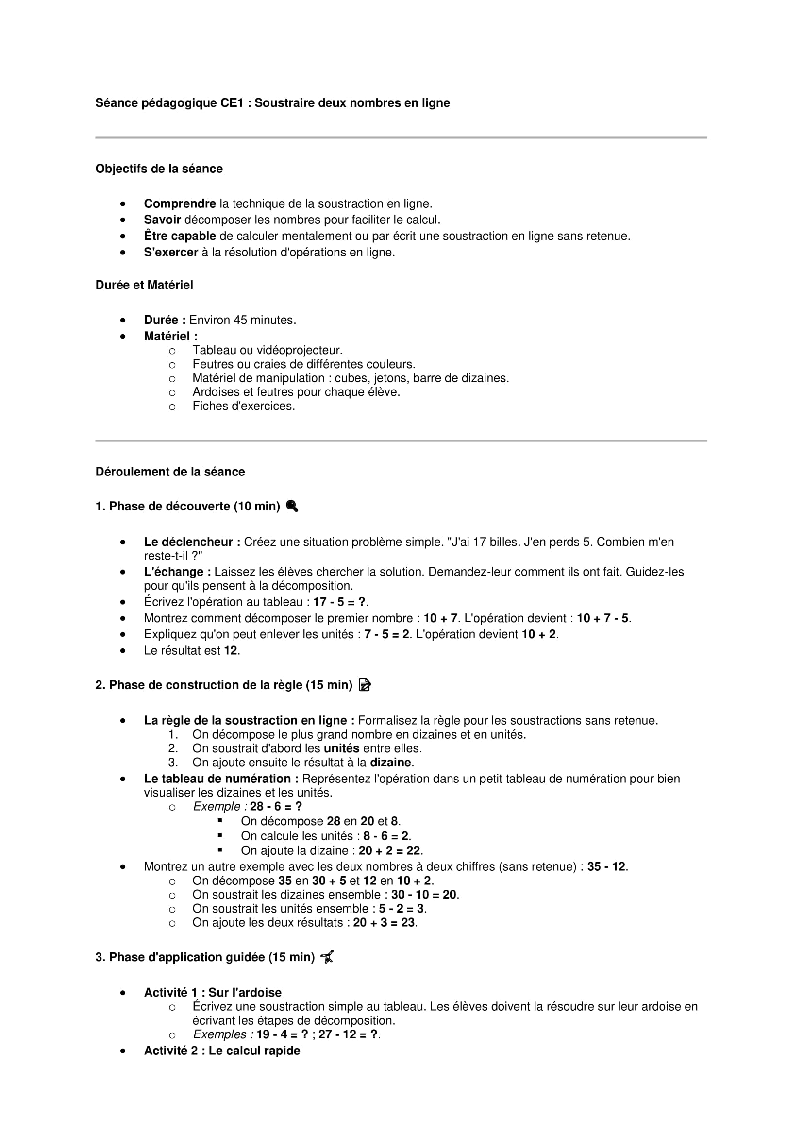 Séances pédagogiques numération La soustraction en ligne CE1