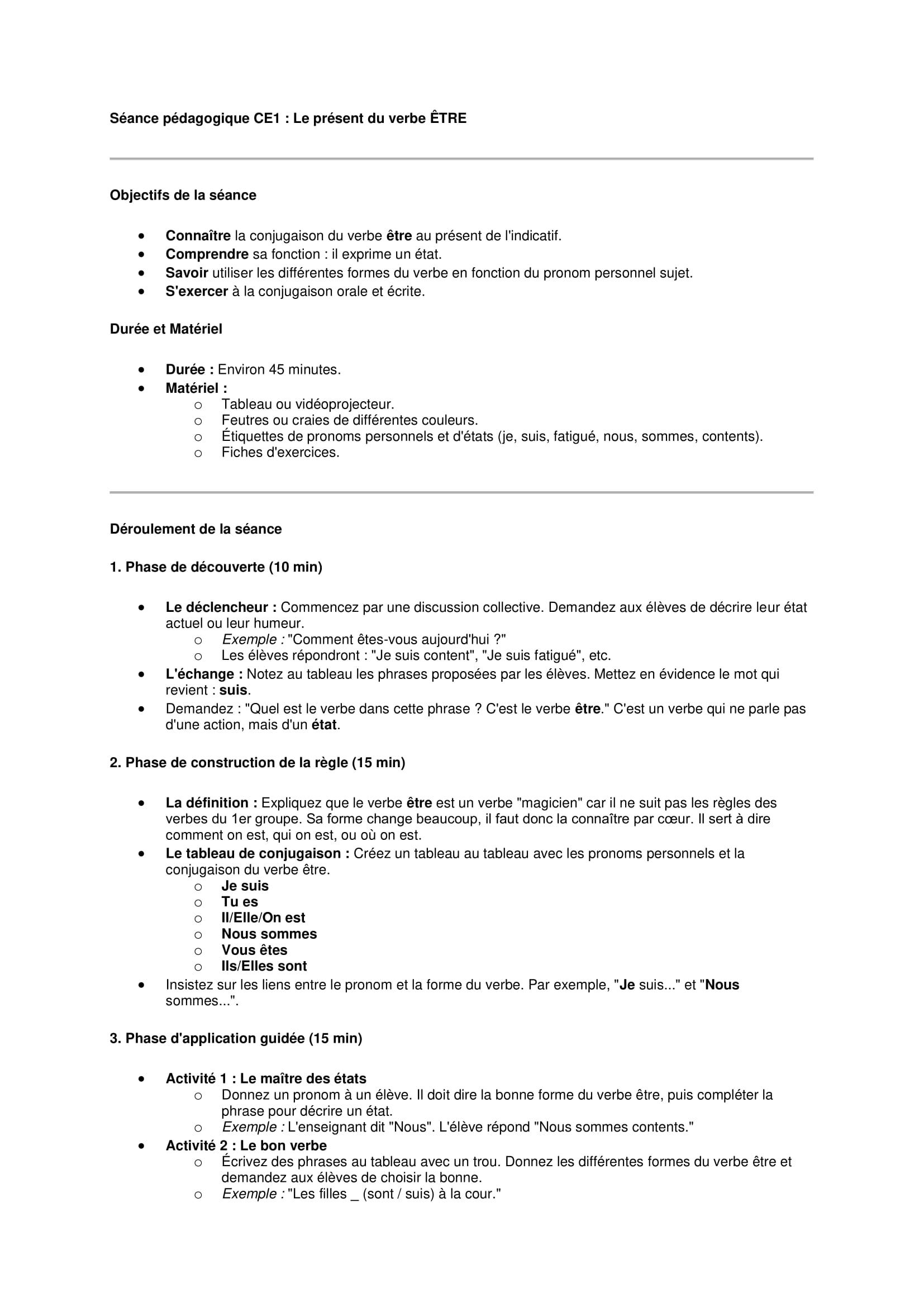 Séances pédagogiques conjugaison Le présent du verbe être CE1