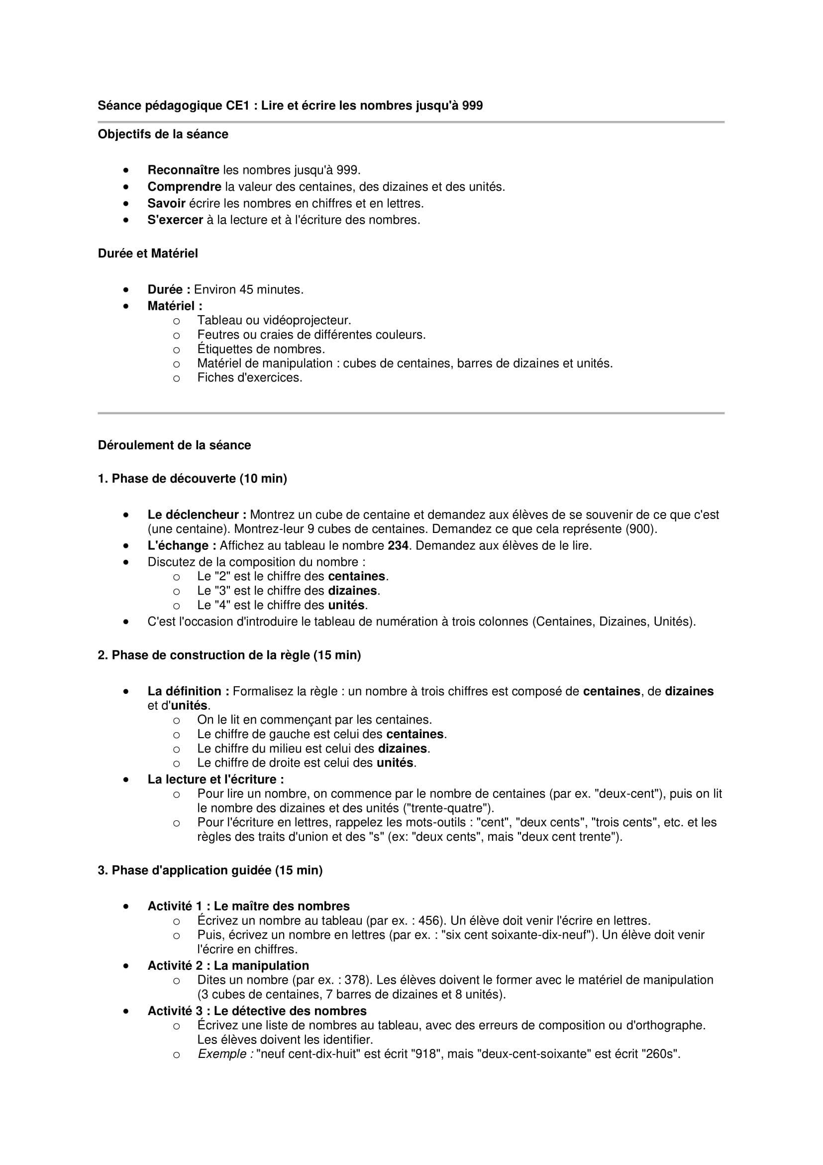 Séances pédagogiques numération Lire et écrire les nombres jusqu'à 999 CE1