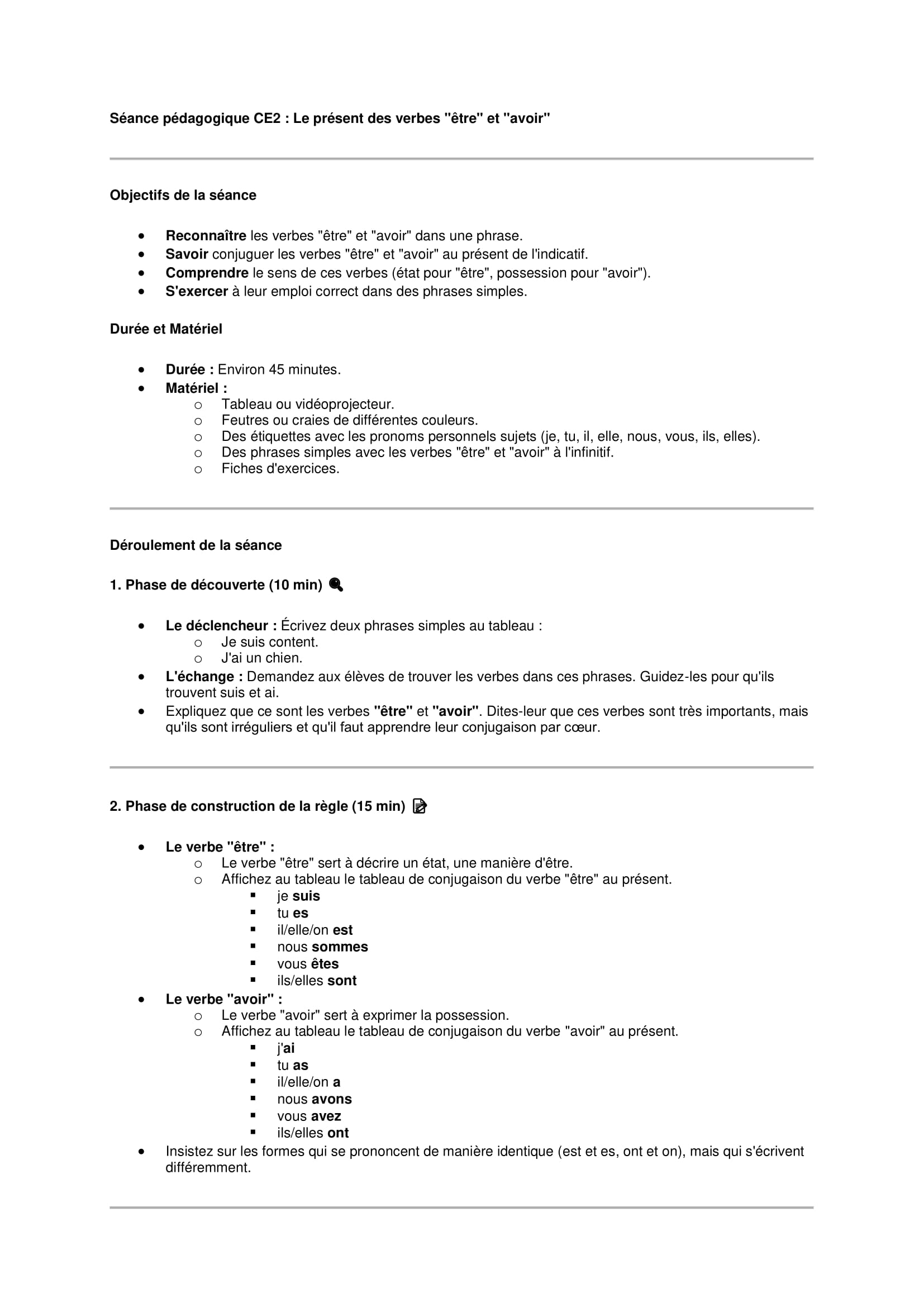 Séances pédagogiques CE2: Le présent des verbes être et avoir