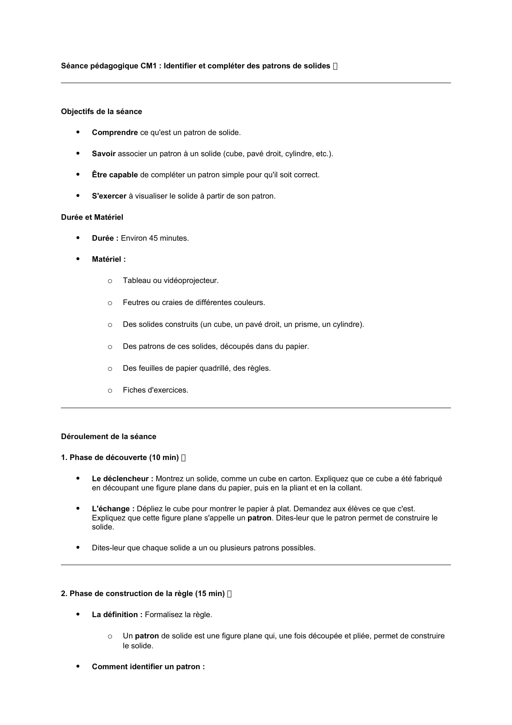 Séances pédagogiques CM1: identifier des patrons de solides