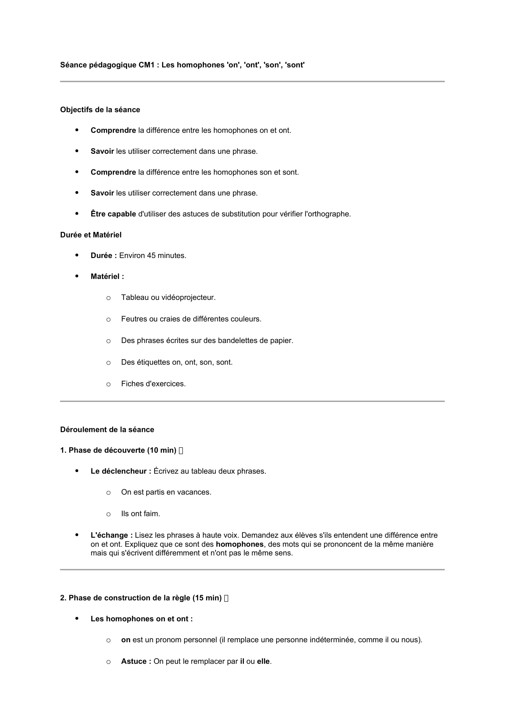 Séances pédagogiques CM1: homophones on-ont son-sont