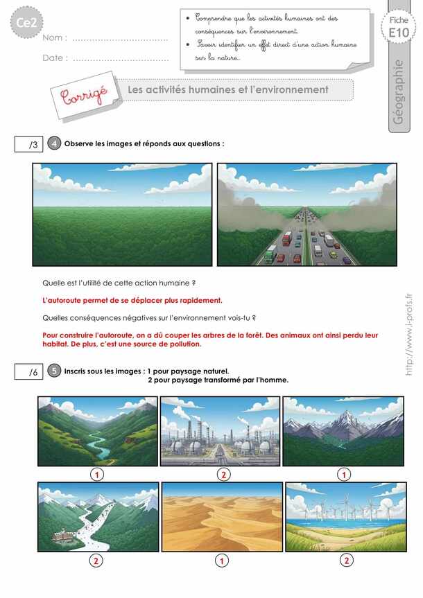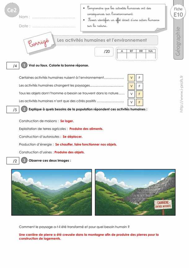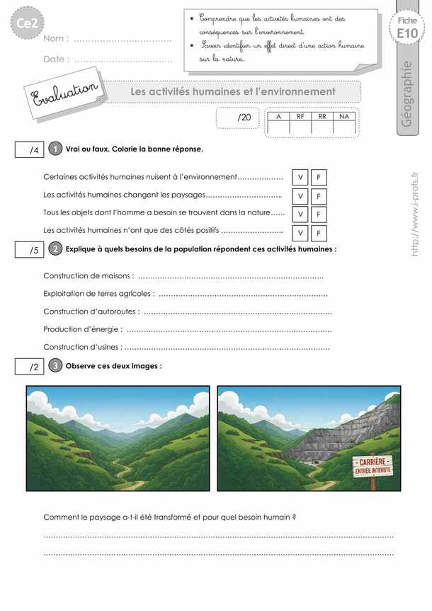 EVALUATION Géographie CE2 Les activités de l'homme et l'environnement