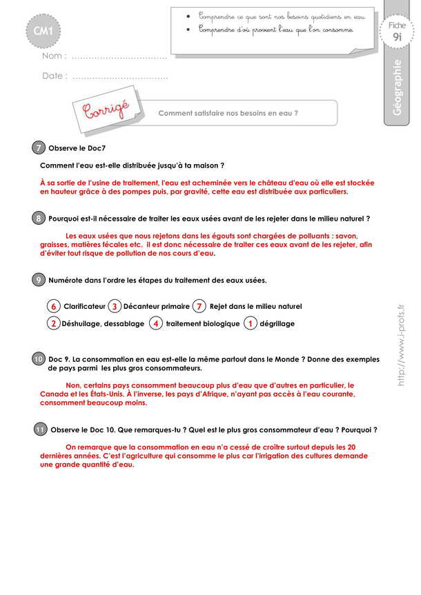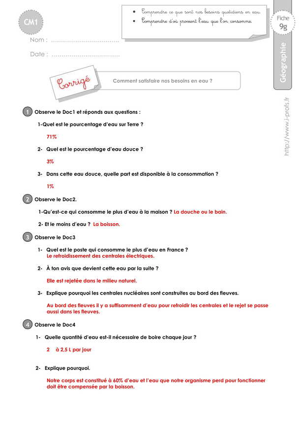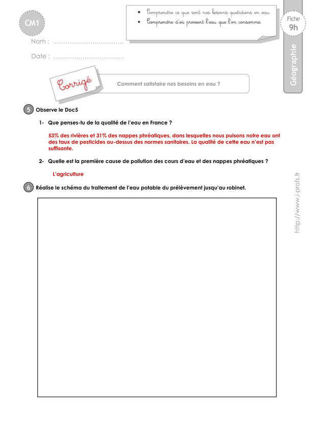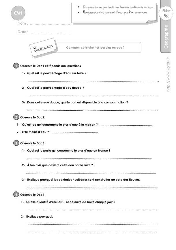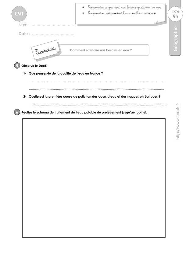 Géographie CM1 EXERCICES: Satisfaire nos besoins en eau