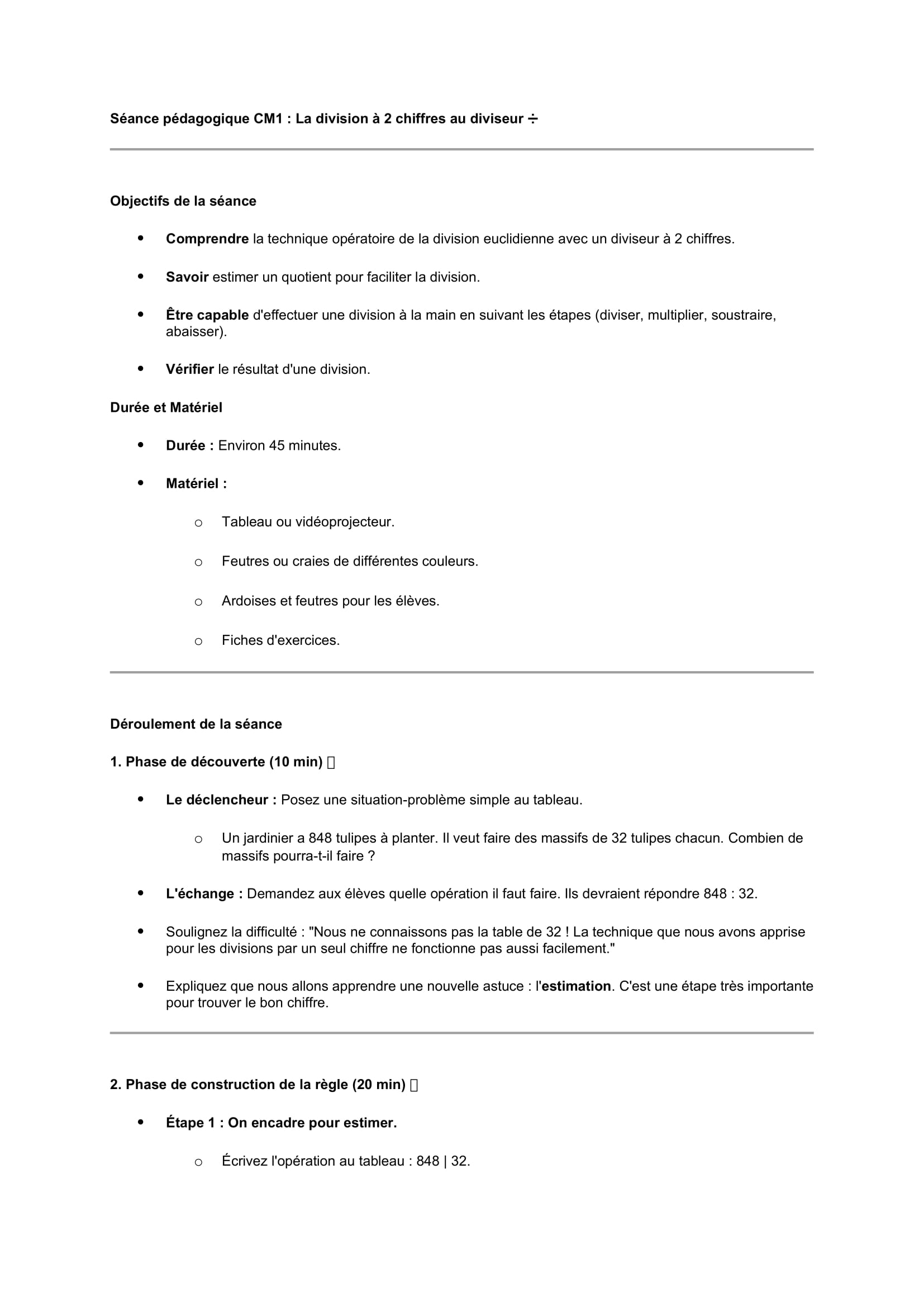 Séances pédagogiques CM1: la division a 2 chiffres