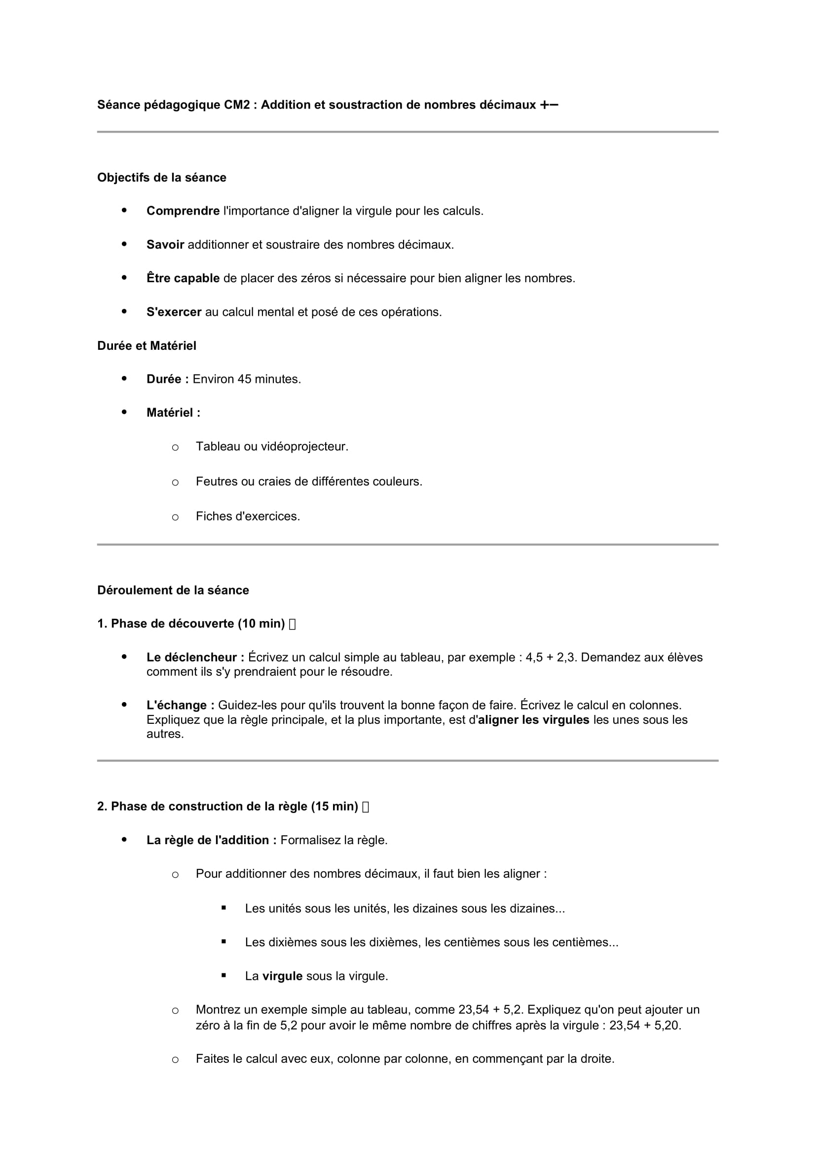 Séances pédagogiques CM2 addition et la soustraction décimale