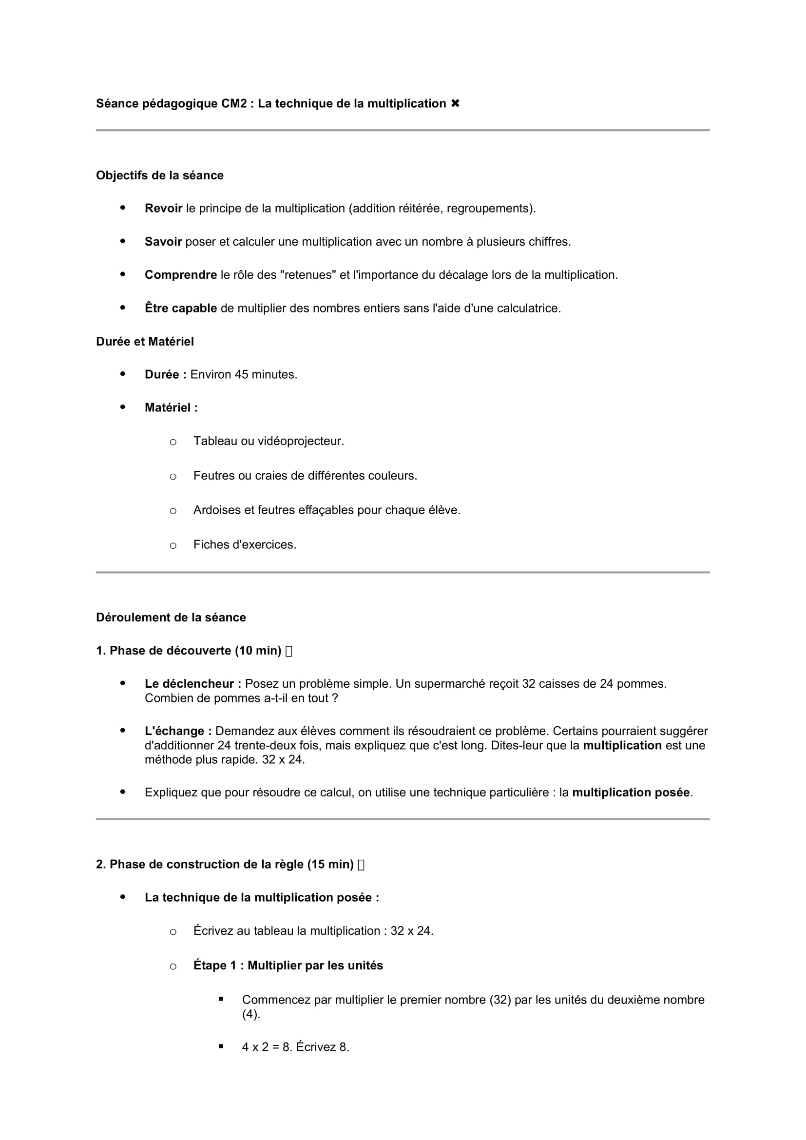 Séances pédagogiques CM2 Technique opératoire de la multiplication