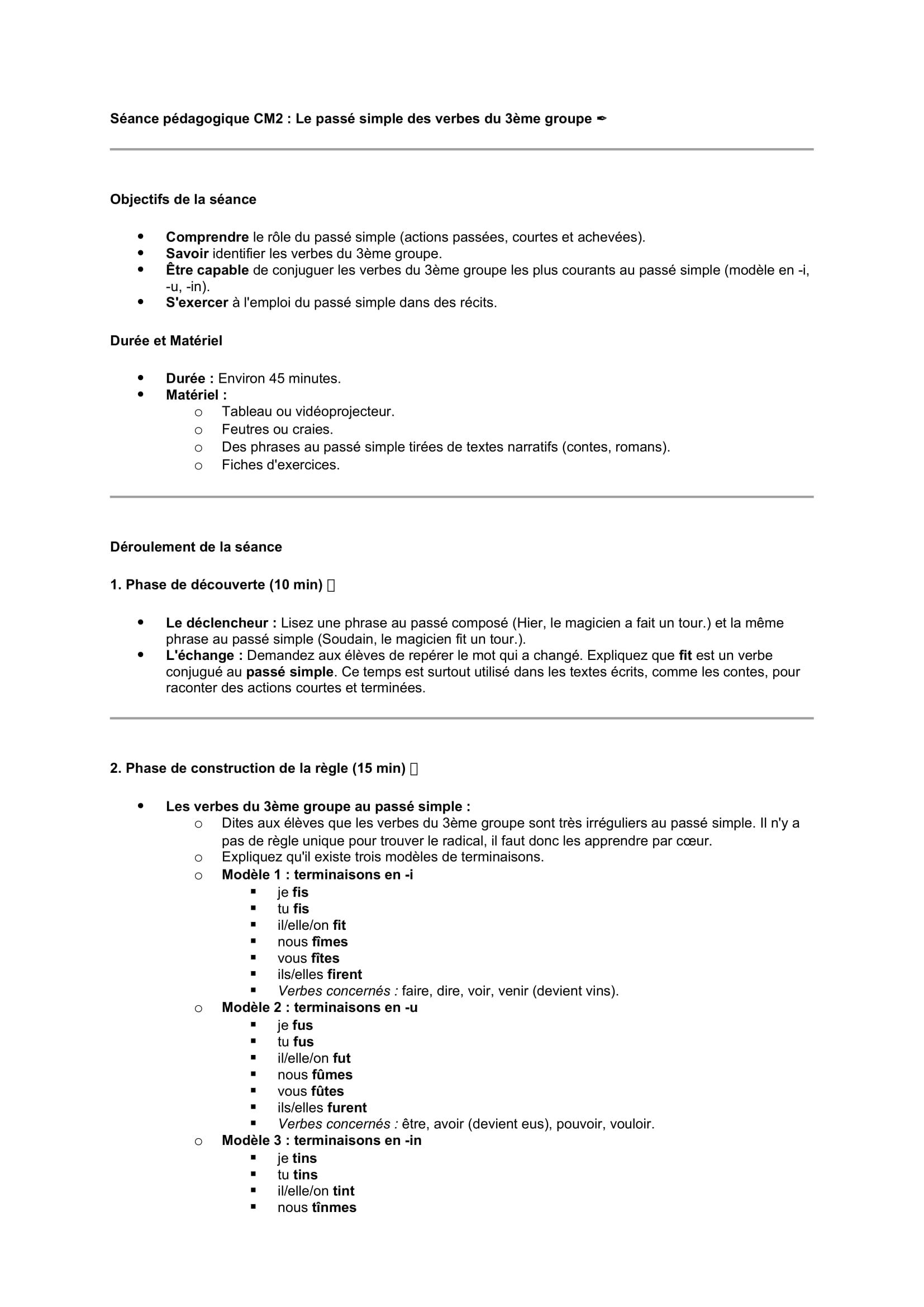 Séances pédagogiques CM2 Verbes du 3ème groupe au passé simple