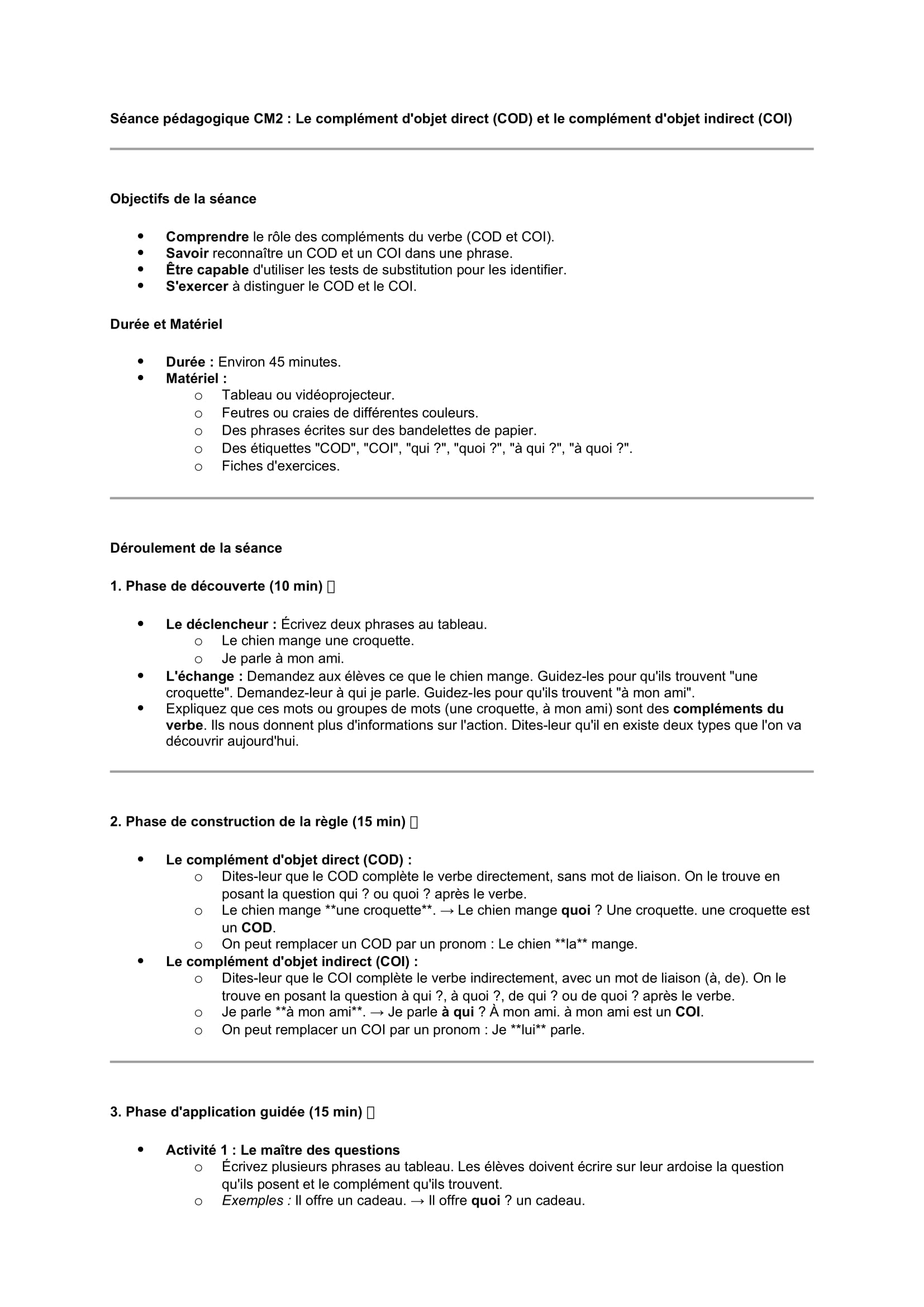 Séances pédagogiques CM2 Les compléments d’objet direct et indirect