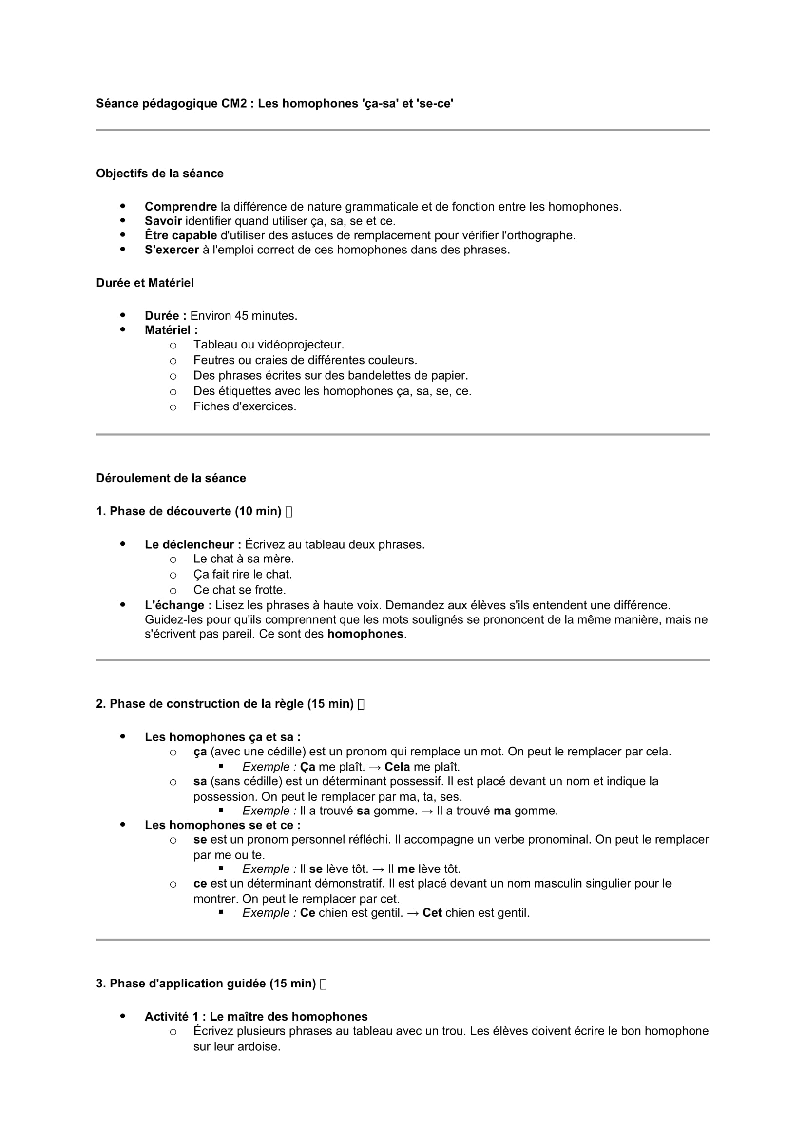 Séances pédagogiques CM2 Homophones ça/sa-ce/se